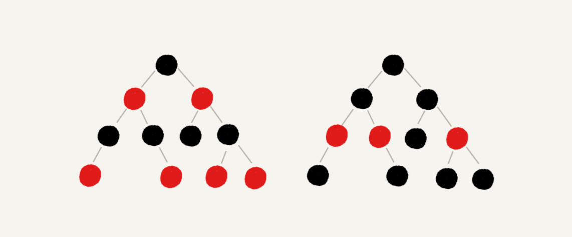 - 如果一个节点是红色的,则他的两个子节点都是黑色的。