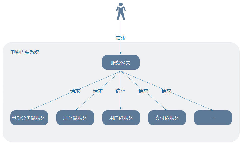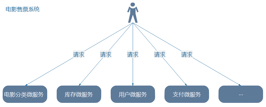 不同的微服务一般会有不同的网络地址,而外部客户端(例如手机APP)可能需要调用多个服务的接口才能完成一个业务需求。例如一个电影购票的手机APP,可能会调用多个微服务的接口,才能完成一次购票的业务流程,如下图所示。