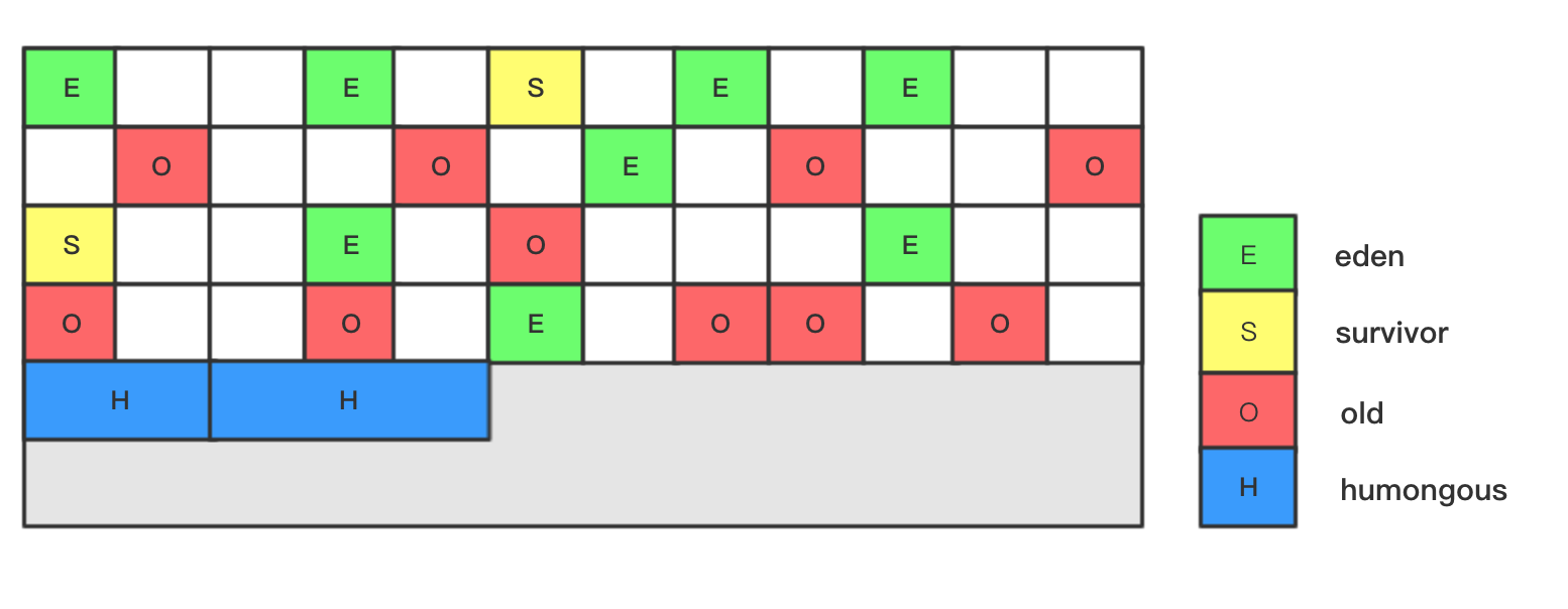 每个 Region 被标记了 E、S、O 和 H,说明每个 Region 在运行时都充当了一种角色,其中 H 是以往算法中没有的,它代表 Humongous,这表示这些 Region 存储的都是超大对象(Humongous Object),当新建对象大小超过 Region 大小一半时,直接在新的一个或多个连续 Region 中分配,并标记为 H。
