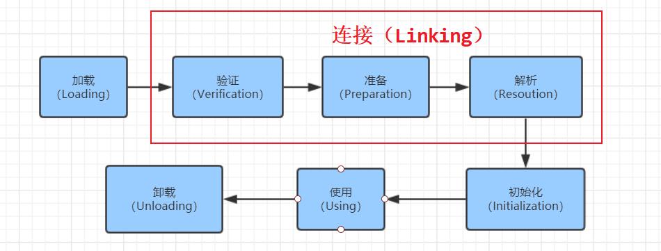 1. 加载:查找并加载类的二进制数据,加载是类加载过程的第一个阶段,在加载阶段,虚拟机需要完成三件事情。1)通过一个类的全限定名来获取其定义的二进制字节流;2)将这个字节流所代表的静态存储结构转化为方法区的运行时数据结构;3)在 Java 堆中生成一个代表这个类的 java.lang.Class 对象,作为对方法区这些数据访问的入口。